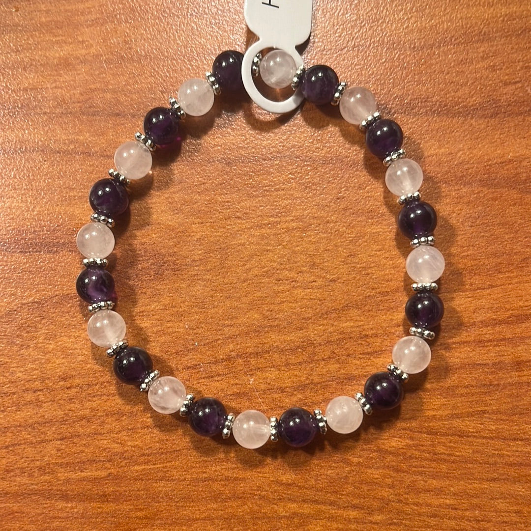 Amethyst and Rose Quartz crystal bracelet made to 7”.
