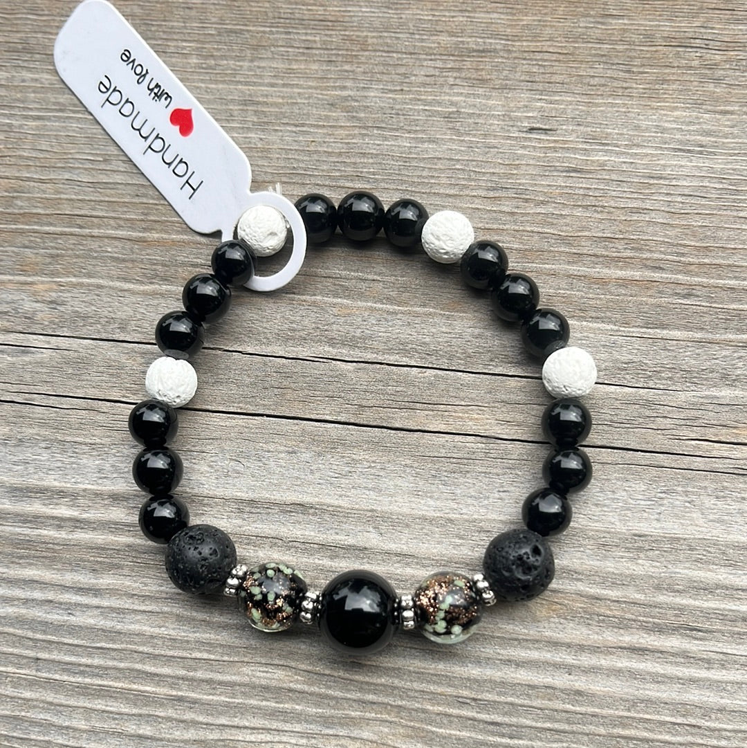 Agate, glow in the dark glass and lava stone crystal bracelet made to 6.5”.