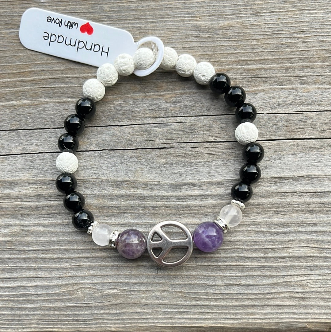 Amethyst, Rose Quartz, Agate and Lava Stone Crystal Bracelet - 7” peace sign
