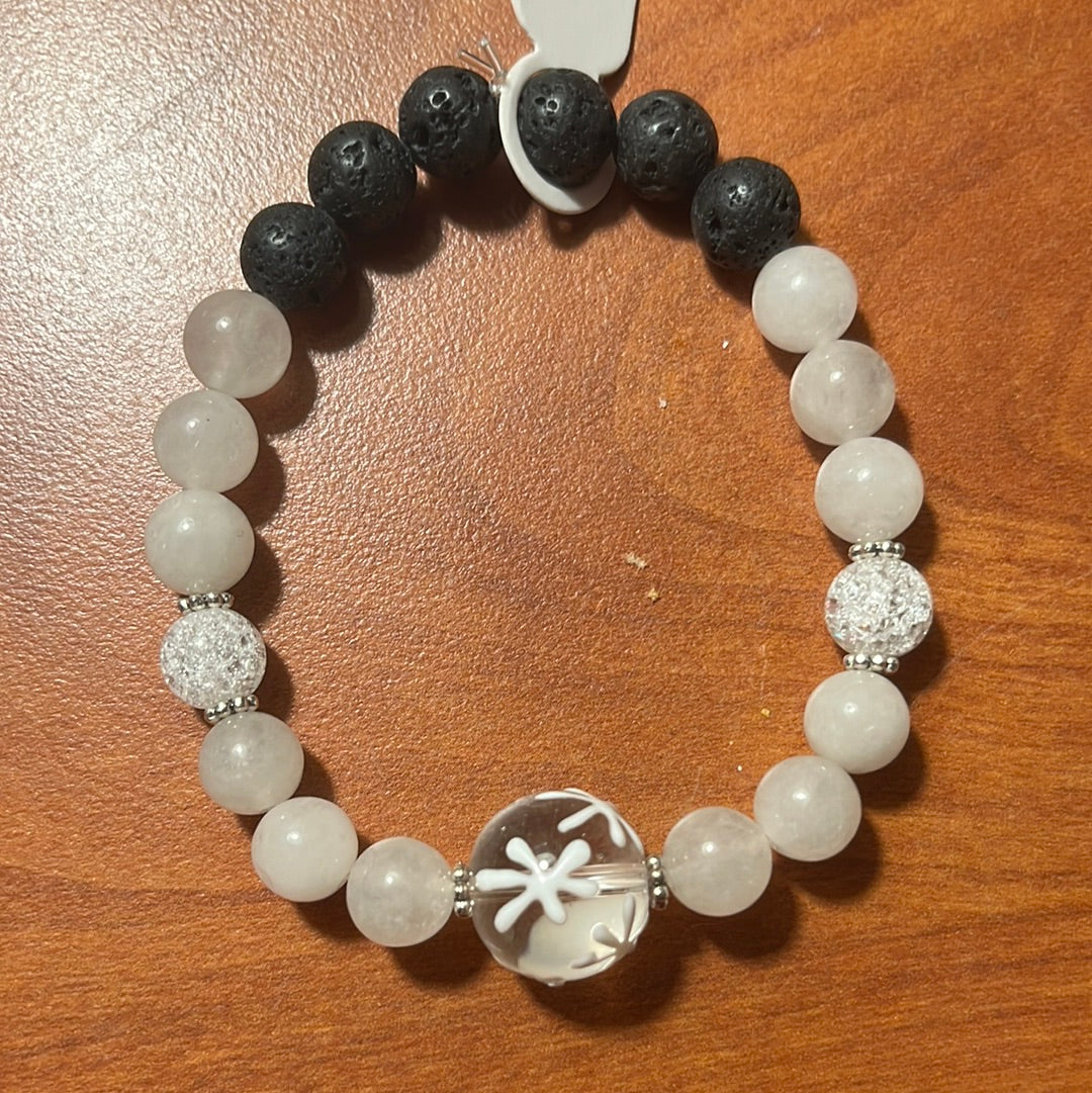 White quartz, crackle quart and lava stone crystal bracelet - 7” snowflake ball